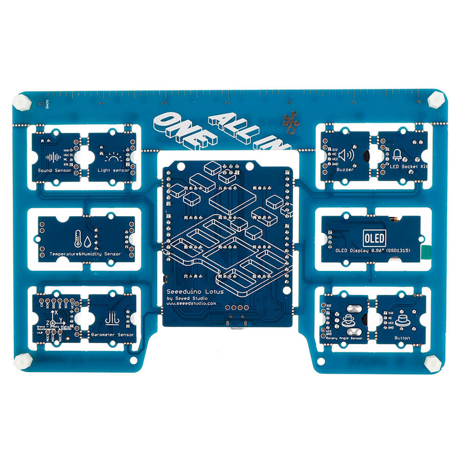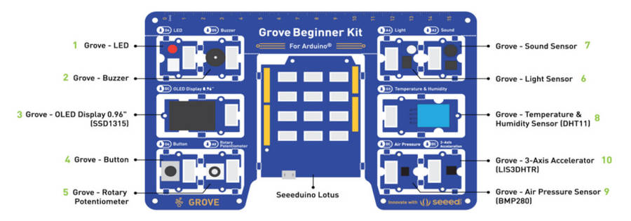 Documentations: Package includes: 1 x Micro USB Cable 6 x Grove Cables 1 x Grove - Buzzer 1 x Grove - OLED Display 0.96 1 x Grove - Button 1 x Grove - Rotary Potentiometer 1 x Grove - Light 1 x Grove - Sound 1 x Grove - Temperature & Humidity Sensor 1 x Grove - Air Pressure Sensor 1 x Grove - 3-Axis Accelerator 1 x Seeeduino L0TUS