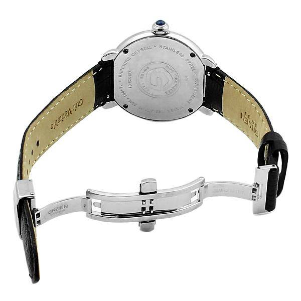 Movement: Swiss made quartz movement. Functions: Hours, minutes, seconds. Watch Case: Polished round stainless steel case. Polished bezel set with 45 genuine diamonds, colour: G/H, clarity: SI 1~2. Case is 39mm diameter (without crown), 8mm thick. Push/pull cabochon crown. Screw in caseback. Watch Dial: White mother of pearl dial. Blued hour and minute hands, red seconds hand. Scratch resistant sapphire crystal. Wrist Strap: Black genuine leather strap. Strap Width: 17mm. Clasp Type: Push button double fold over deployment clasp with logo. Will fit 8.5 inch wrist. Water resistant: 30 meters