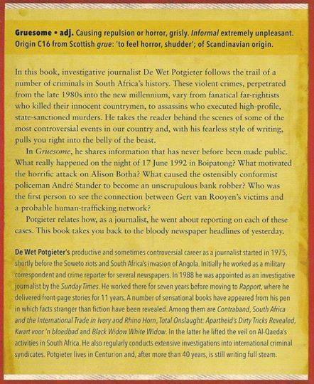 Very well written true crime book, with chapters including Feri Barnard/CCB, Eugene De Kock/Vlakplaas, Barend Strydom and the post-94 Right Wing bombers. Excellent condition. Illustrated. Tracked postage is R40.00.