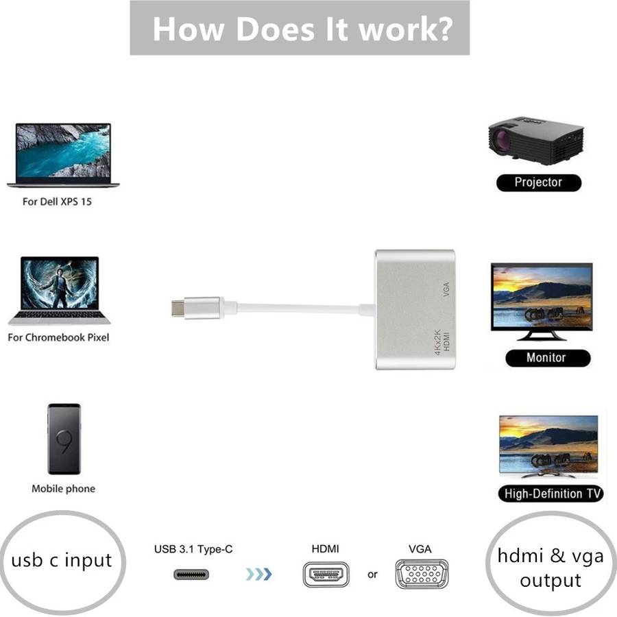 Type C to HDMI VGA Adapter Supports video resolution up to 4K 30HZ. when use HDMI alone, It support a large screen liquid crystal TV or display compatible with 4K(3840x2160P/30Hz) max output.