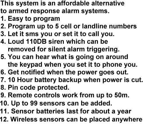 GSM Alarm system. Insert sim card and it will sms or phone you when triggered.