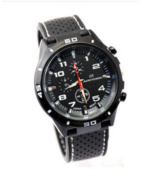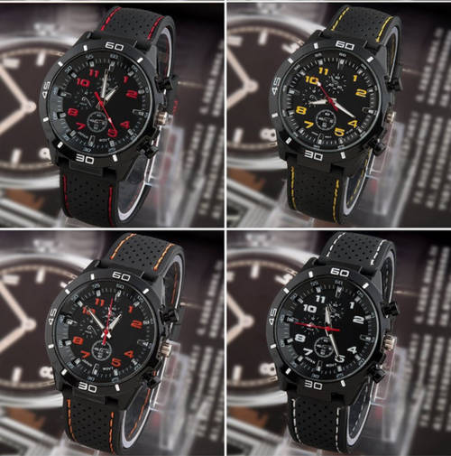 This is watch is sporty and looks like a military watch. the straps are made of silicone with fabric stitches on the edge. The colour of the stitches matches the colour of watch numbers. The two black buttons are for decorative purposes.