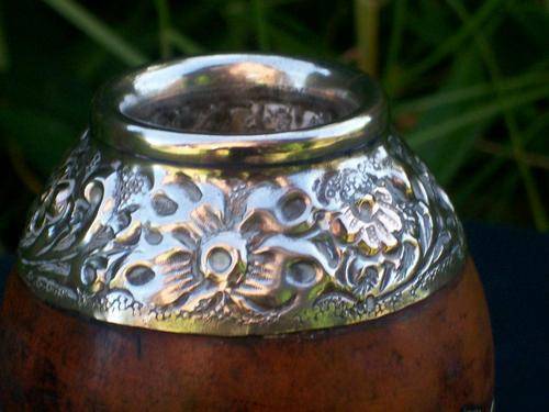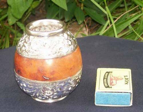 ORIGINATING IN SOUTH AMERICA, A MATE OR GUAMPA IS A GOURD (USUALLY DECORATED IN SILVER OR GOLD) IN WHICH MATE TEA, MADE FROM THE LEAVES OF THE MATE TREE, IS BREWED AND COMMUNALLY SHARED USING A STRAW CALLED A BOMBILLA. THIS GUAMPA IS DECORATED IN 800 SILVER (MARKED ON THE BOTTOM) AND MEASURES 7.5 CM HIGH.