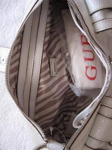 Guess by MARCIANO featuring a brand new ladies handbag. It has a sleek smooth white leather design with one strap for under the arm. There is a big guess logo buckle that closes the bag. This bag is very sturdy and the inside is a silky animal print with Guess logo. Also includes guess protective cotton bag as seen above. Perfect bag for a night out, very elegant!