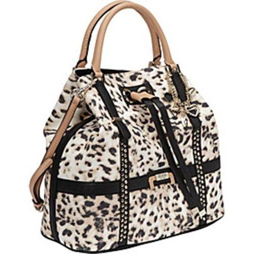 Combining the carry-now cache of bucket bags with the versatility of your favorite satchels, this leopard-print carryall is our latest style solve-all. Tote it from desk to date night for a look with undeniably sexy appeal. Leopard-print canvas exterior. Contrast faux-leather trim with polished stud detail. Gold-tone hardware. Removable charm cluster. Drawstring closure at top Interior features a zipper pocket, cell phone pocket and additional multipurpose pockets. Signature 4-G logo print lining. Dual top handles with 15cm drop. Detachable shoulder strap with 36cm drop