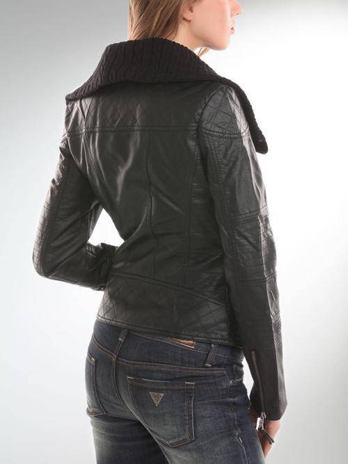 Edgy and sweet, this adorable jacket is too hard to resist. Long sleeve design features lightly stitched detail, double zipper side pockets and over-sized cable knit collar. Zippered main closure.
