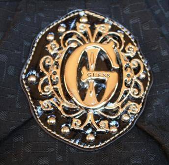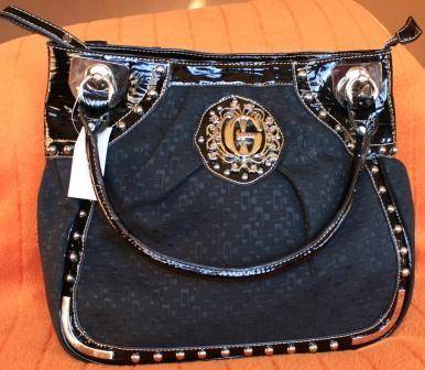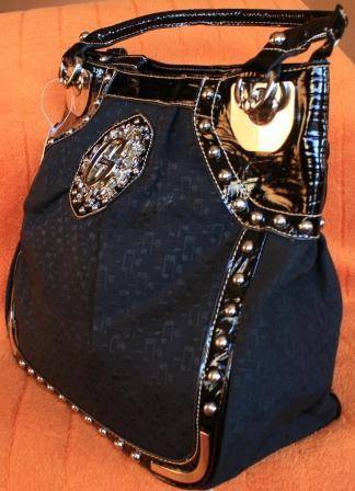 LARGE CARRY-ALL STYLISH BLACK MATERIAL HANDBAG WITH INSETS OF PATENT LEATHER. THERE IS AN AMAZING "G" LOGO, WITH THE GUESS SIGNATURE IN AN OVAL METAL SCROLLED DESIGN IN THE CENTRE FRONT OF BAG. SILVER STUDS ACCENTUATE THE BEAUTIFUL DESIGN OF THIS HANDBAG.