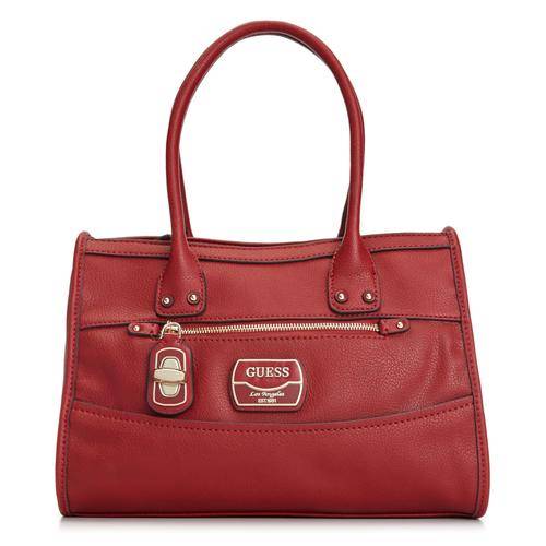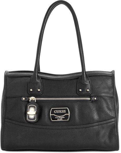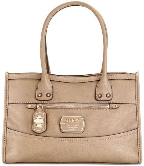 Turned out in soft faux leather with gilded hardware, this ladylike satchel is a wardrobe must. Spacious, pocket-lined with a shoulder-right shape, signature detailing finishes the look. From guess. Guess bag. Faux leather. Double top handles with 7" drop. Top zip closure. Silver-tone hardware; front zip pocket with turnlock detailing; logo plaque at front. Interior features zip pocket and 3 slip pockets.