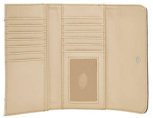 Top flap with snap closure. Rear exterior zip pocket. Brand name hardware. Lined interior with bill pocket, credit card slots and an identification window
