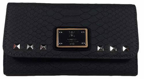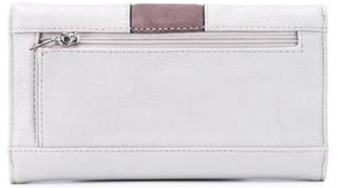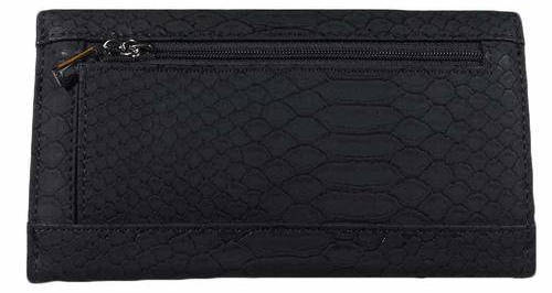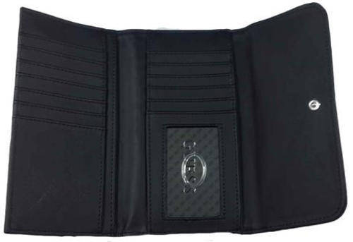 Top flap with snap closure. Rear exterior zip pocket. Brand name hardware. Lined interior with bill pocket, credit card slots and an identification window