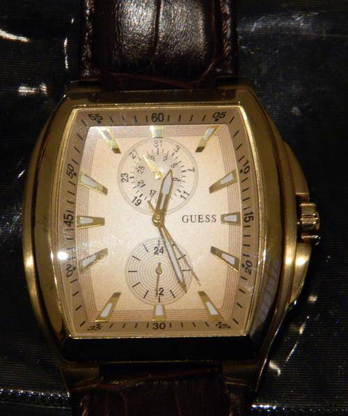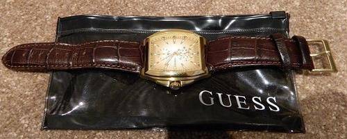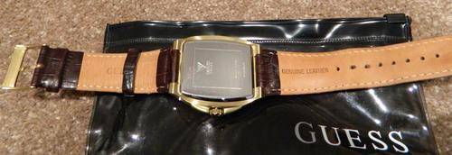 Rectangle shaped Gold tone 45mm wide bezel. Mat gold tone face