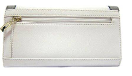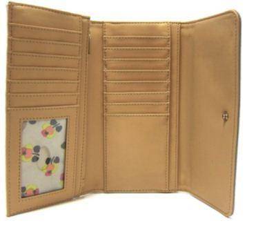 Top flap with snap closure. Rear exterior zip pocket. Brand name hardware. Lined interior with bill pocket, credit card slots and an identification window