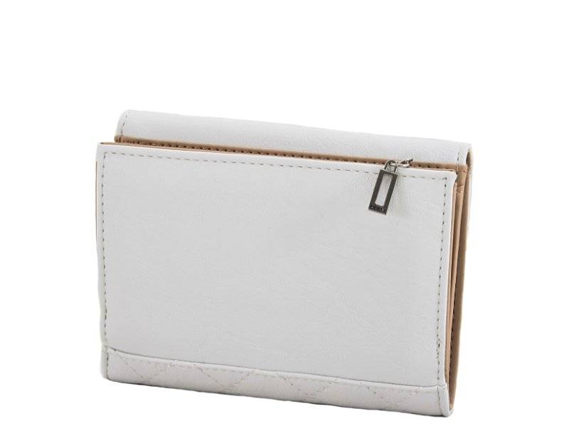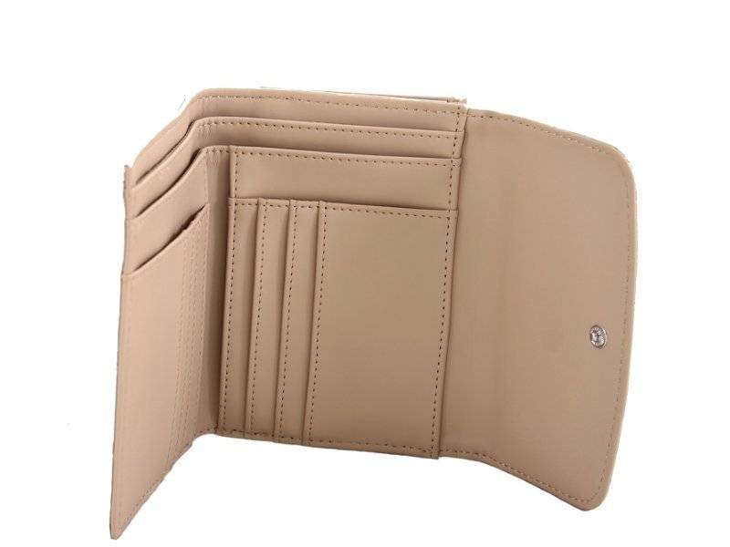 Top flap with snap closure. Rear exterior zip pocket. Brand name hardware. Lined interior with bill pocket, credit card slots
