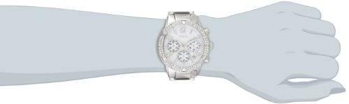 Fashion-forward and unquestionably timeless; this sporty chronograph watch sets any look apart from the crowd. Ultra-posh crystal detailing adds the perfect finish. Chronograph function: stopwatch; day; date and 24 hour international time Watch dimensions in mm: 41/41/19 Polished silver-tone case with crystal detail Mother of pearl dial Polished silver-tone steel bracelet Water resistant to 100m/330ft 10 Year Limited Warranty Women's Accessories Watches Guess Watches