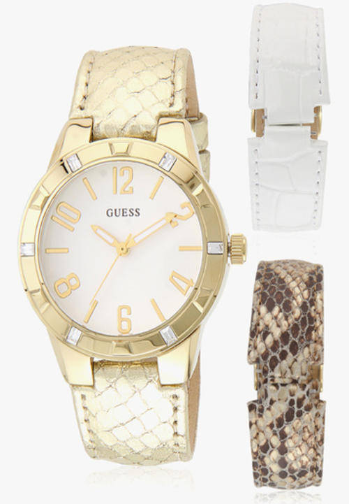 Invest in this golden timepiece from GUESS and see how compliments come your way. Classy and appealing, this analog watch featuring a trendy leather strap will certainly speak volumes about your unique style. Made from stainless steel, this analog watch is sturdy and a valuable pick. This 50 m water-resistant watch has 2-year warranty. Moreover, this analog watch comes with 2 extra straps.