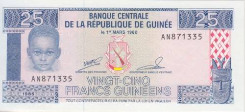GUINEA 25 FRANCS 1985 P28 UNC. STOCK PICTURE - SERIAL NUMBER MAY DIFFER.HOUSE RULES - so things can go smoothly.EK IS AFRIKAANS VIR DIE WAT IN AFRIKAANS WIL KOMMUNIKEER.