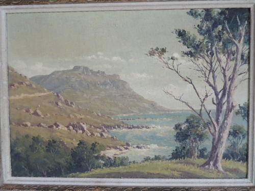 Exquisite painting of shoreline, mountains and trees in the foreground. Framed size 43cm X 56cm, unframed size 29cm  X 42cm.