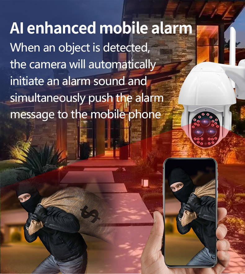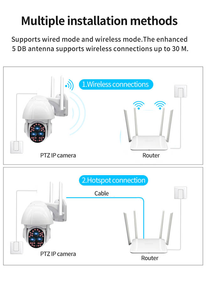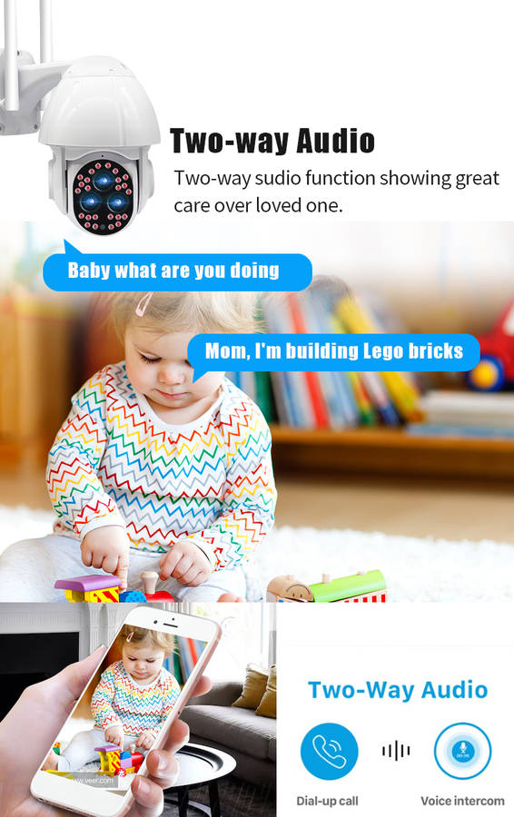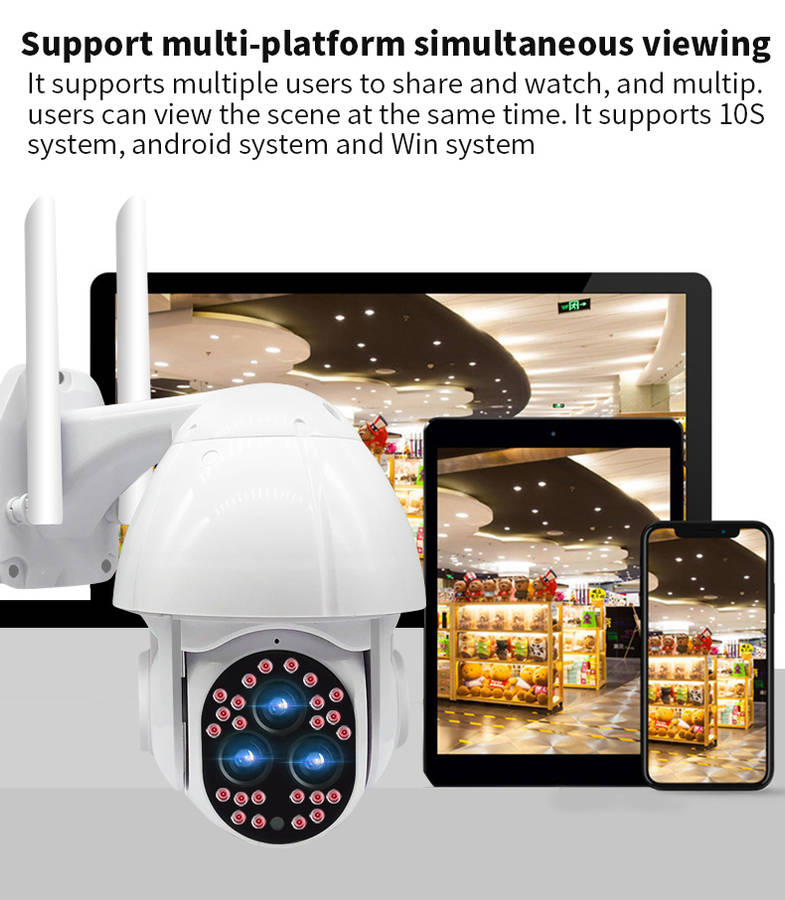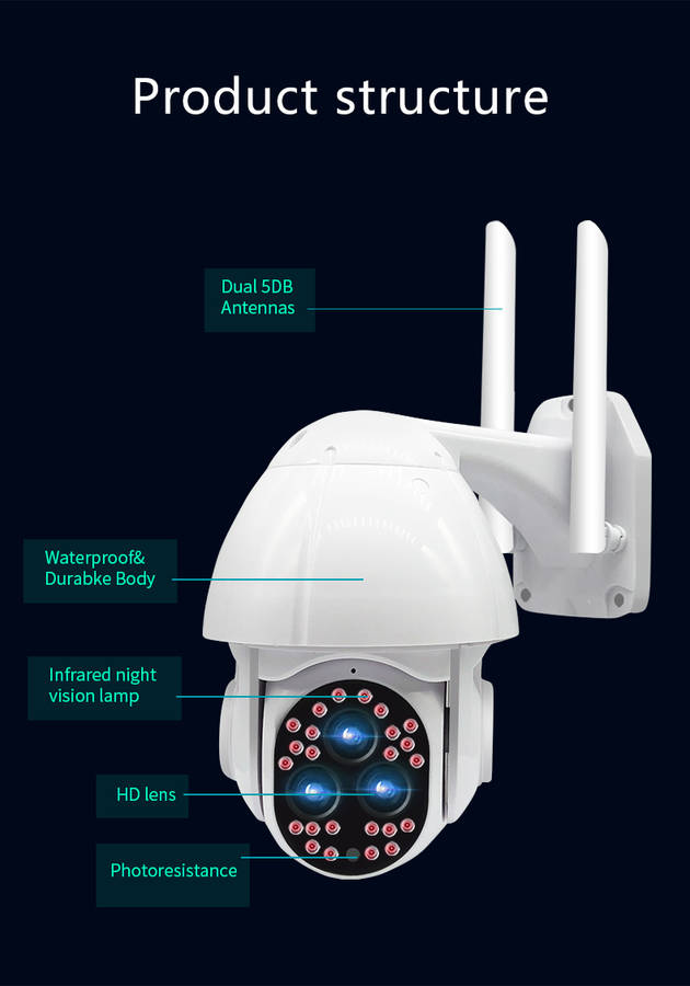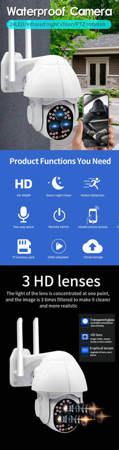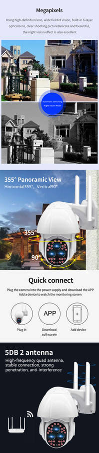 Features : - Outdoor 1080P network camera. - Red light and blue light warning. - IP66 is waterproof and has good sealing. - Two-way voice communication. - Infrared night vision, full color night vision, smart night vision, three monitoring modes. - Intelligent motion detections combined with motion detections technology to trigger an alarm. - High-efficiency infrared array with low power consumption and illumination distances up to 100 meters. - High resolution, which can be switched at any time according to different environments and different needs. - Use your mobile app to remotely monitor your home from your phone anytime, anywhere. - With motion detections alarm function, an alarm is triggered when you send a message to your mobile phone when an abnormality is triggered at home. - The camera has a hotspot WIFI and usually does not monitor network connection hotspots.