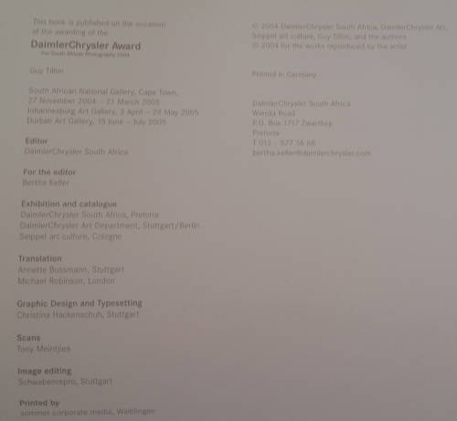 Book published on occasion of the awarding of Daimler Chrysler Award for South African Photography 2004. Black and white and colour photographs. Plus text of photographs taken in Angola, Congo, Burundi, Eritrea and Mozambique.