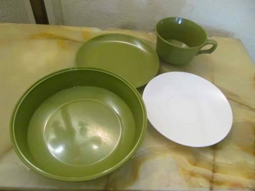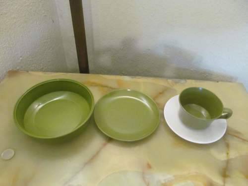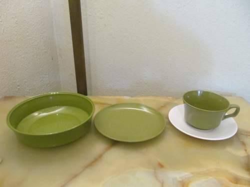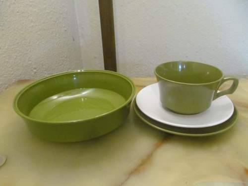THE ITEMS CAN BEST BE DESCRIBED AS RETRO IN THEIR DESIGN WITH AN OLIVE GREEN BOWL, SNACK DISH AND TEACUP AND A WHITE SAUCER ADDING A MODERNIST TWIST TO THE DUO