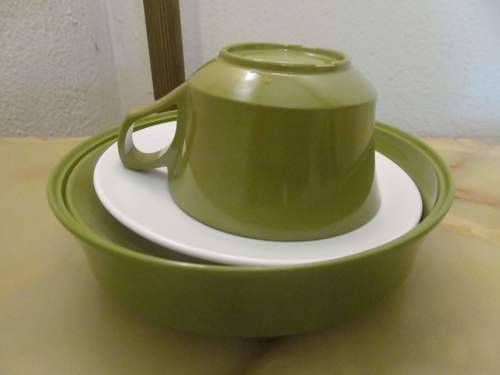 CONTEMPORARY LOT / SET OF OLIVE GREEN MELAMINE BOWL, SNACK DISH AND TEA DUO (RETRO WHITE SAUCER) - ALL ITEMS REPRODUCTIONS OF GUZZINI DESIGNER STYLE