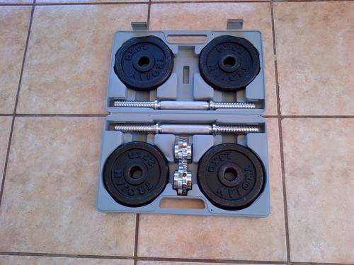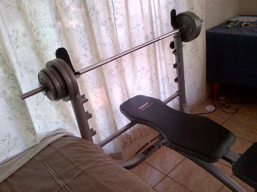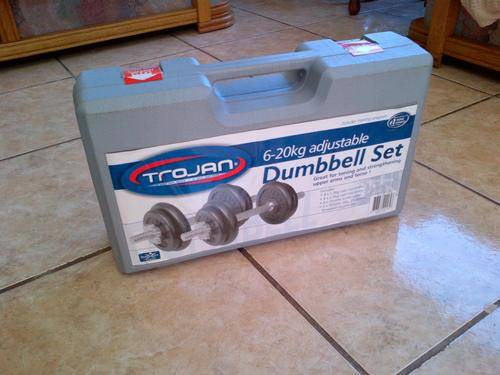 Item is in an 'as new' condition: it has only been used for two months and have been very lightly used during that time. It is only being sold because I got a job out of town, and my new lodgings is way too small to utilize the bench and weights. Original packaging is still intact. Includes: a bench, a barbell with 33kg of weights, and 2x Dumbbells with 14kg weights (as a set, includes a carrying case). See below for images of each individual part.