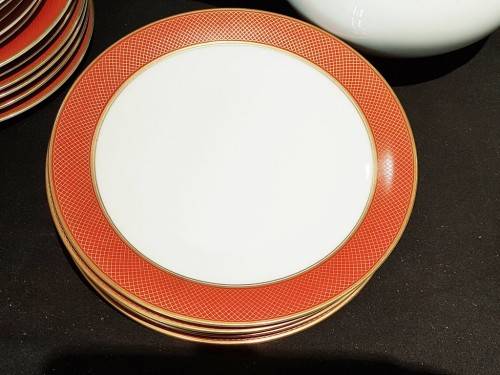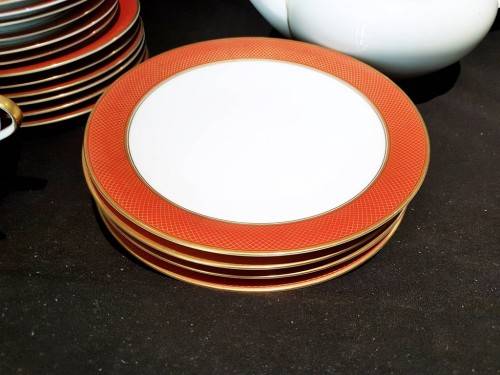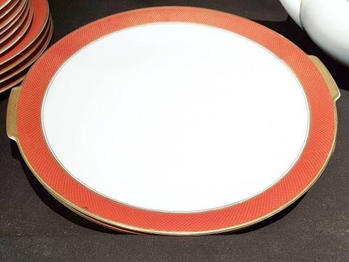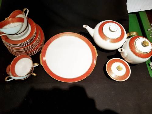 The cups measure 11cm in diameter and stand 4cm high. The saucer and cake plate measures 15cm and 17cm in diameter respectively. There are 6 trio's. Included are 4 side plates measuring 19.5cm in diameter. There is also 2 cake platters measuring 28cm in diameter. The sugar bowl measures 12cm in diameter. The tea pot stands 11.5cm high and the coffee pot stands 15.5cm high