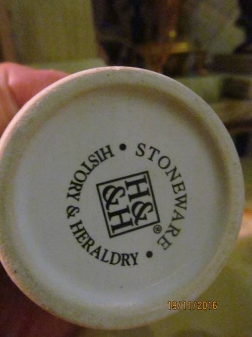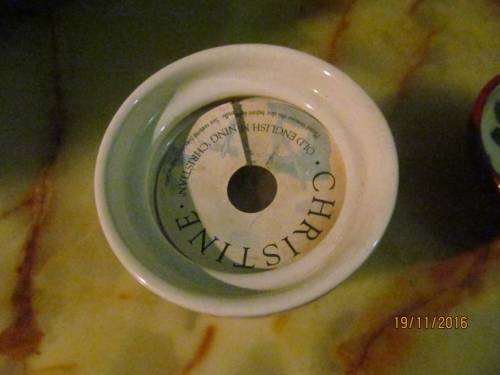 1- H & & H Stoneware Candle holder with Colorful Floral images portrayed around the sides as well as the Name -- "Christine" along with the meaning of the name. On the other side in Cursive is -- "May this little candle light up your day" The item is stamped underneath -- "H && H, Stoneware, History & Heraldry" Although the item does contain a candle inside the candle has been lit and burned for approx 2 minutes leaving a depression of about 0.5cm depth. Other than this the Item is in PERFECT condition with NO chips, cracks or damages. 7.2cm height............5.2cm diameter at base...........7.5cm diameter at top
