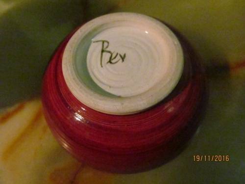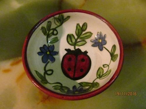 2- A Ceramic bowl with a Floral and Vine pattern hand Painted inside along with a Ladybug. This Bowl is signed -- "Bev" underneath. The item is in PERFECT condition with NO chips, cracks or damages. 2.8cm height..........7.5cm diameter at rim