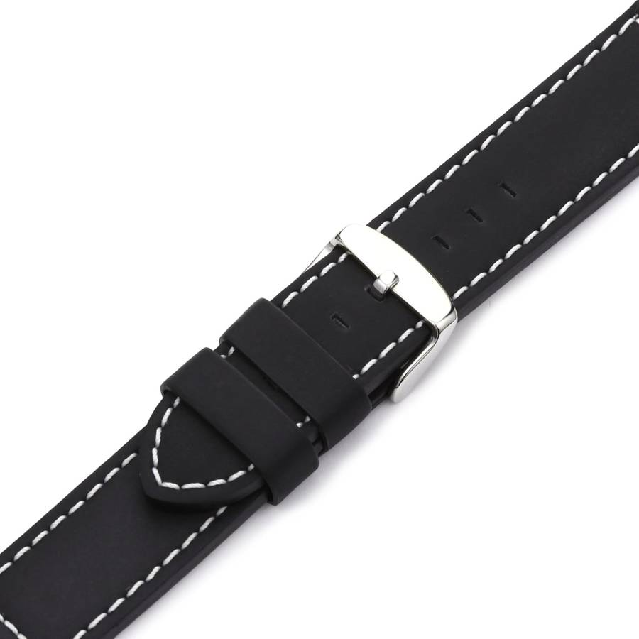 Genuine silicone layered over genuine leather top material Cut-edge construction with waterproof painted edges Heavy padding with off-white contrasting color stitching Genuine beige lorica hypo-allergenic and waterproof lining leather Stainless steel hypo-allergenic buckle Watch Information Brand, Seller, or Collection Name Hadley Roma Model number MSM740RA 200 Part Number MSM740RA 200 Clasp Buckle Band Material Synthetic leather Band length Men's Standard Band width 20 Band Color Black