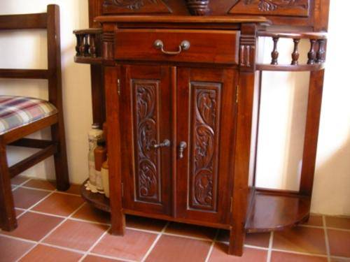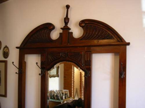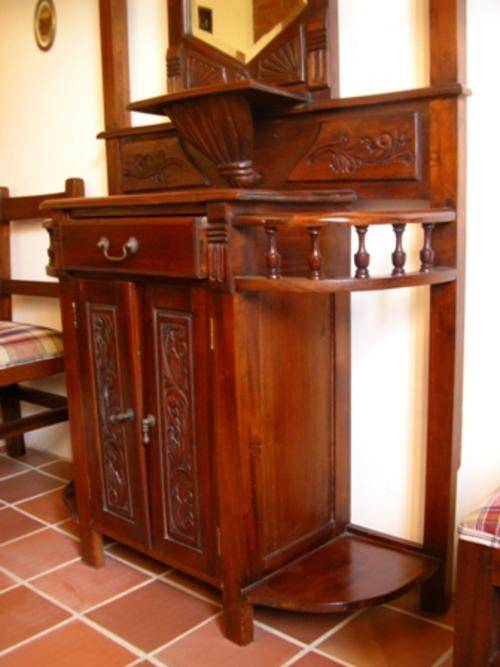 Hall Stand Kiaat (Teak) with bevelled mirror, with 2 door cupboard and drawer, brass hooks and umbrella stands. 100cm x 35cm x230cm H.