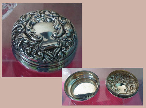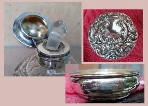 HALLMARKED EMBOSSED SILVER PILL BOX AND SILVER TOP SCENT BOTTLE