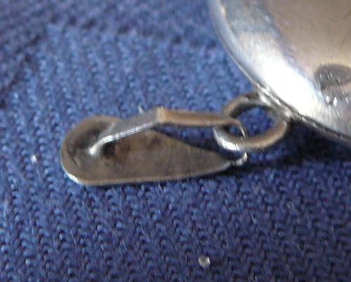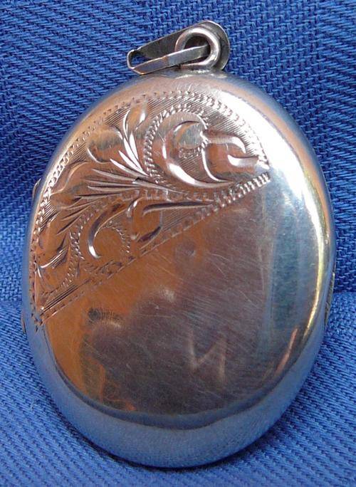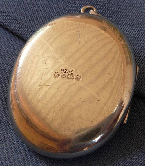 This lovely Oval Hallmarked Locket has three minor dings which gives it character, but generally it is in good condition. It was made in Birmingham in 1988 by Joseph Smith & Sons. There is a card liner glued to the inside of one half (probably as a backing for a photo). It is stamped 925S. It measures 40 mm x 33 mm and weighs 12 grams.
