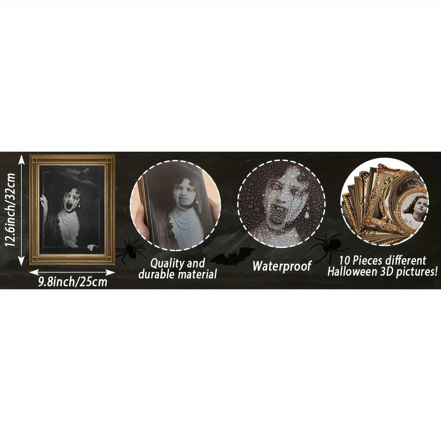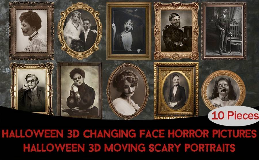 ᄀᄒPackage Includedᄀ10 pieces different 3D face changing pictures, when you move from different angles, the scary ghost and normal images will change, square, round, oval ghost pictures meet your various Halloween decoration needs