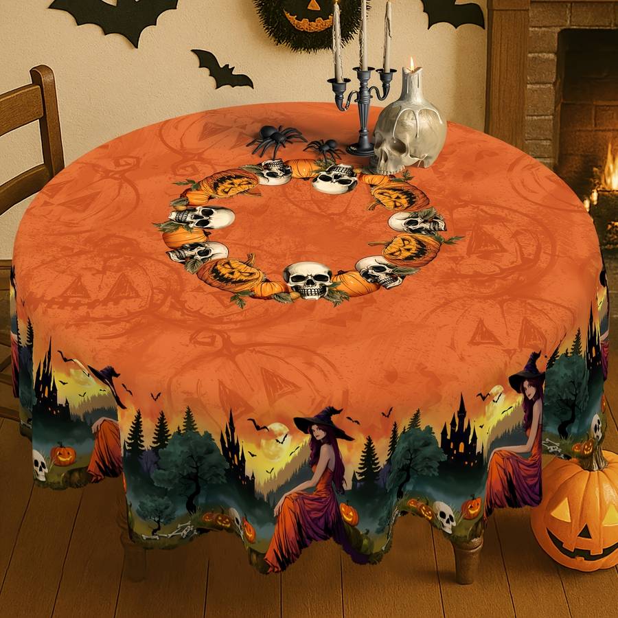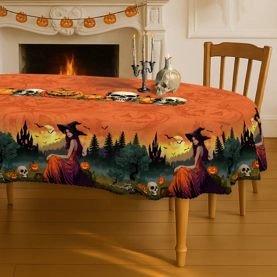 Transform your dining space into a bewitching Halloween haven with our stunning Orange Halloween Witch Tablecloth! Featuring an elegant witch, a mysterious forest, and a haunting castle design, this tablecloth is the perfect centerpiece for your Halloween party, kitchen, dining room, patio, or picnic. The vibrant orange backdrop with playful pumpkins, skulls, and bats Spooky Halloween Witch Tablecloth with Enchanting Castle Design adds a festive touch to any setting.