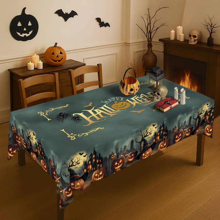 1pc Halloween Tablecloth - Gothic Pumpkin Castle Graveyard, Bats, Jack Lanterns Weave Type:Machine Made Material:Polyester Occasion:Generaling Fit Holidays:Halloween Pattern:Cartoon Composition:100% Polyester