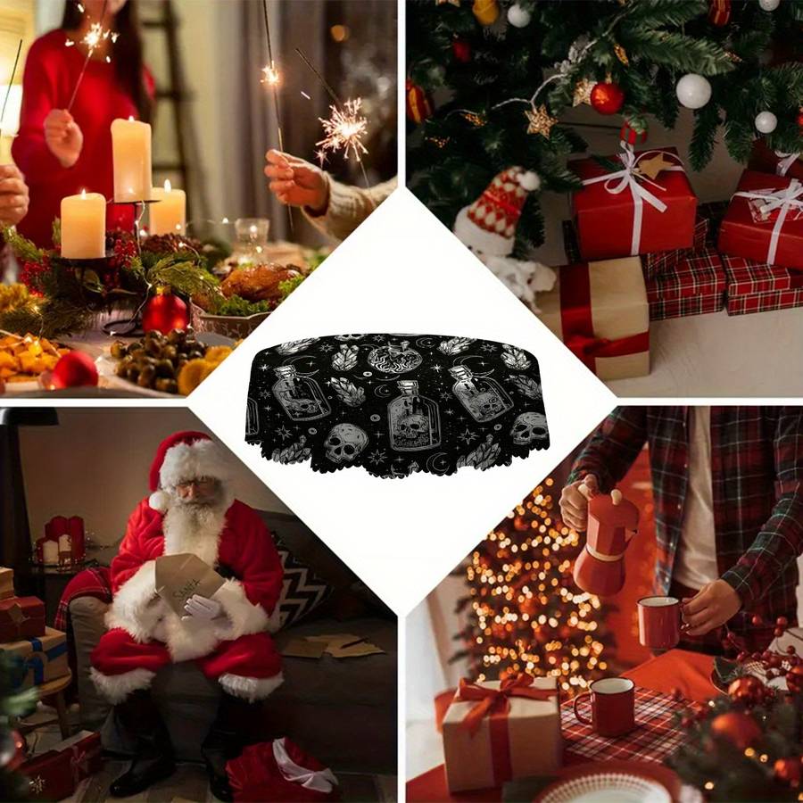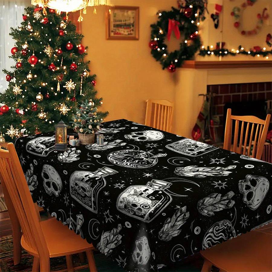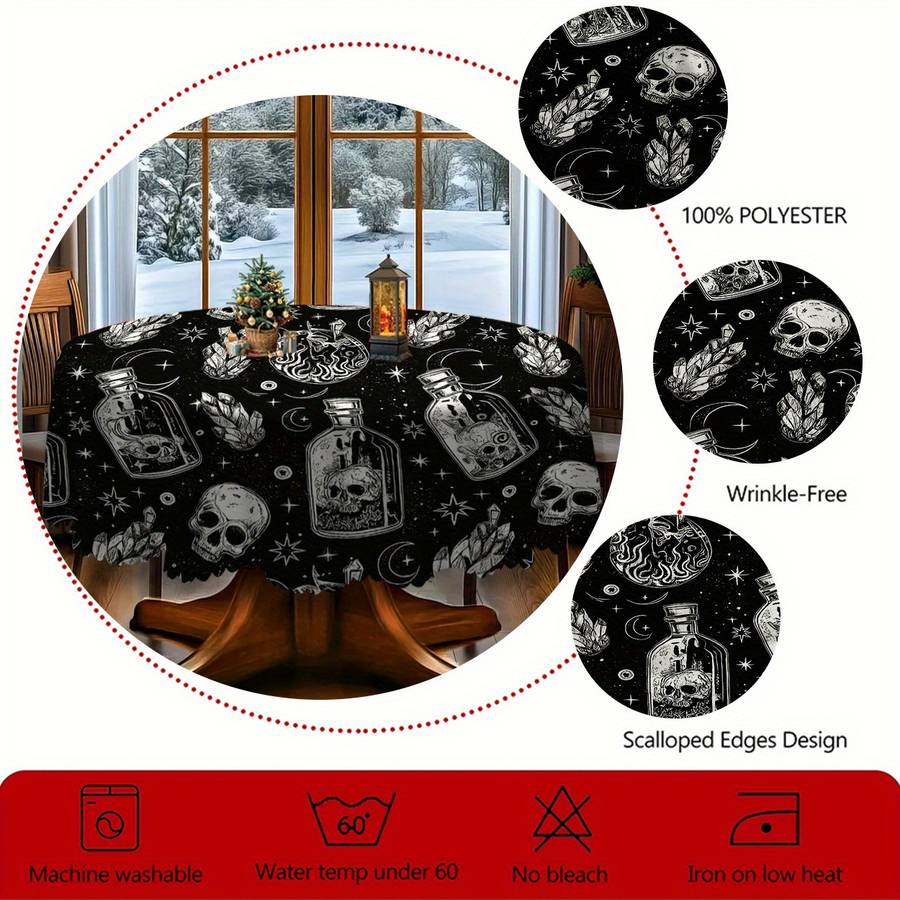 1pc Gothic Halloween Tablecloth - Black Background with Skulls, Bottles, Stars -Weave Type:Machine Made Material:Polyester Occasion:Generaling Fit Holidays:Universal Pattern:Other Patterns Theme:Other Topics