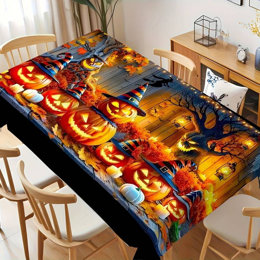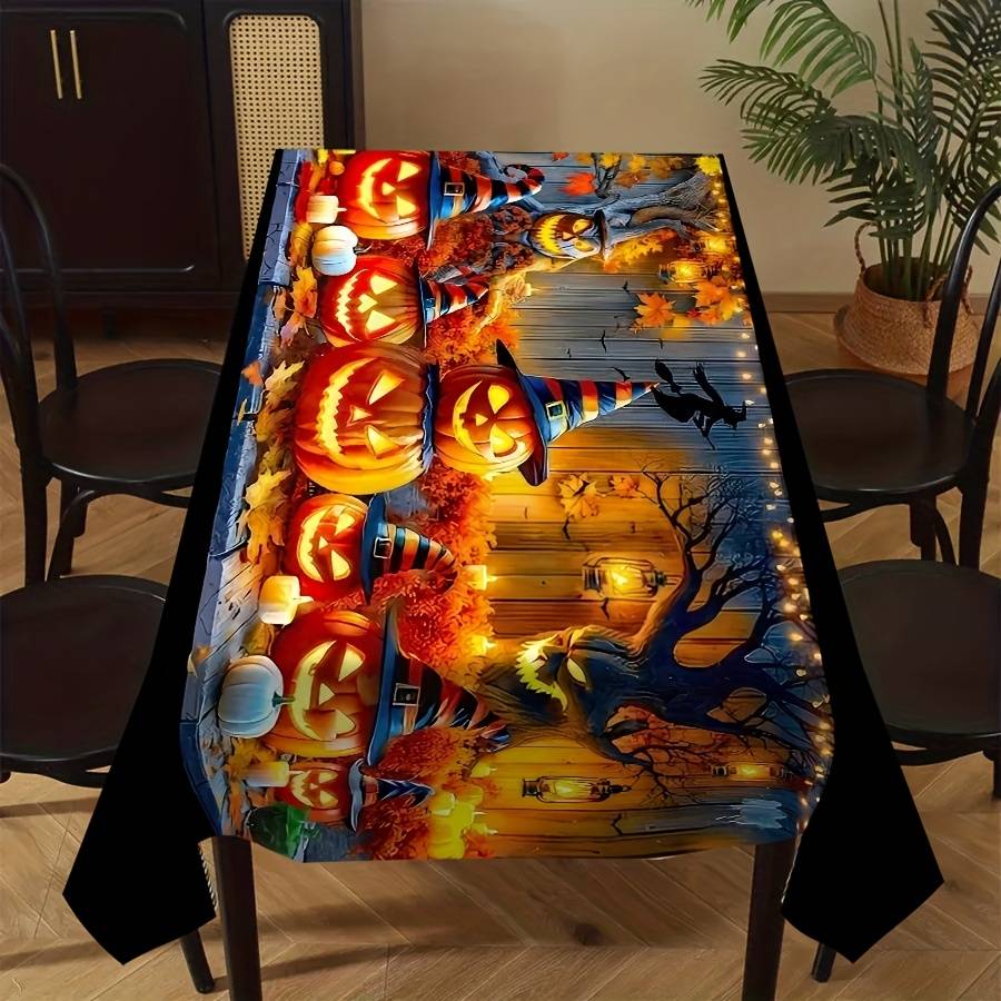 1pc Halloween Witch Hat Pumpkin Face Tablecloth - Autumn Leaves & Haunted House Shape:Rectangle Weave Type:Machine Made Holidays:Halloween Material:Polyester Cover Material:100% Polyester Filling Material:100% Polyester Lining Material:100% Polyester Weaving Method:Woven