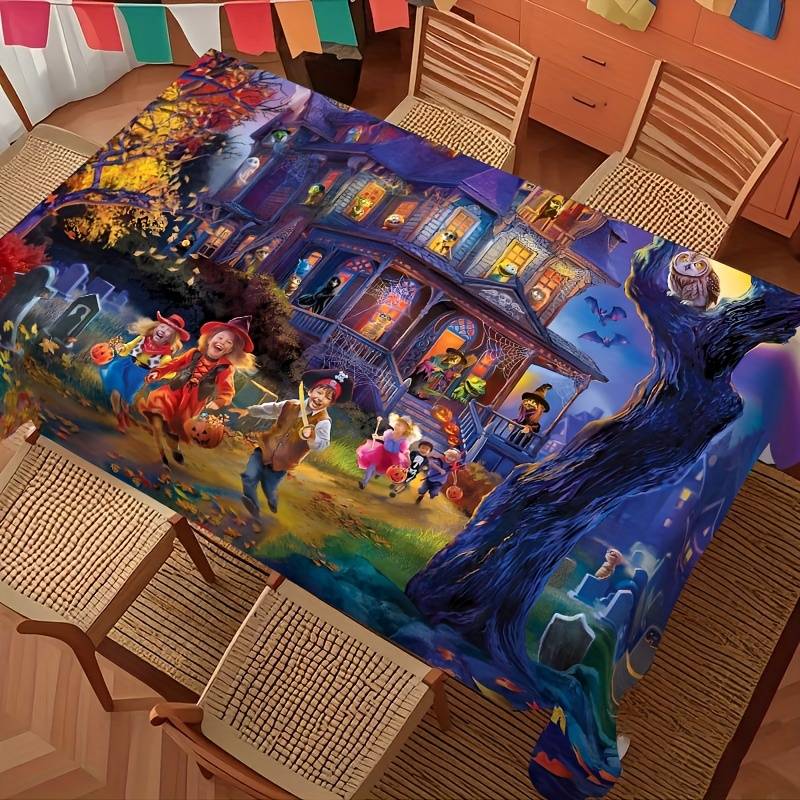 1pc Witch Castle Tablecloth - Black Halloween Trick or Treat Design, Perfect fShape:Rectangle Weave Type:Machine Made Holidays:Christmas Pattern:Cartoon Material:Polyester Cover Material:100% Polyester Filling Material:100% Polyester Lining Material:100% Polyester Weaving Method:Woven