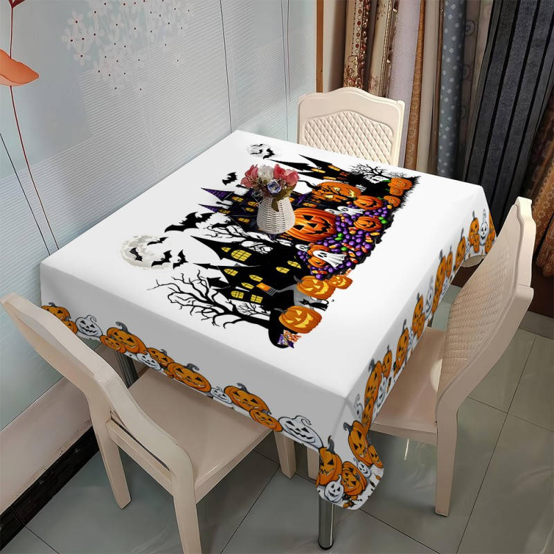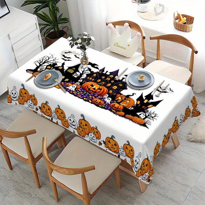 1pc Halloween Pumpkin-Themed Tablecloth - Spooky Jack-O'-Lantern & Bat Design, LShape:Rectangle Weave Type:Machine Made Material:Polyester Cover Material:100% Polyester Weaving Method:Woven