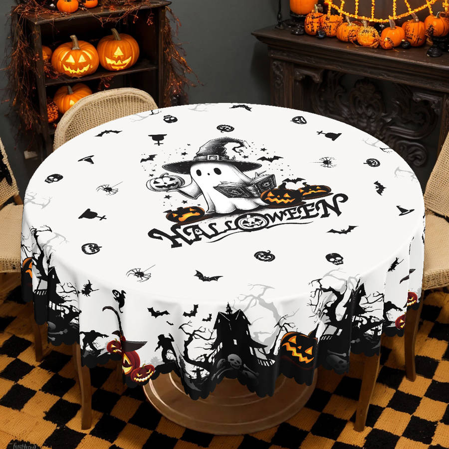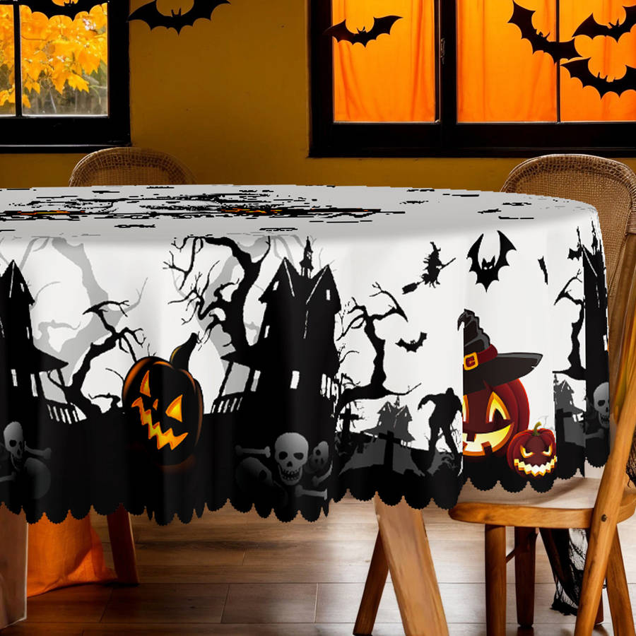 1pc Halloween Tablecloth - Spooky Bat, Pumpkin, Skeleton Castle Design - Black &Shape:Round