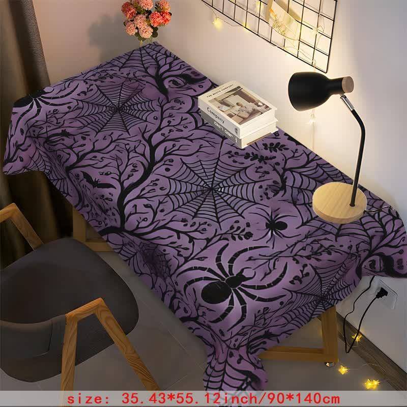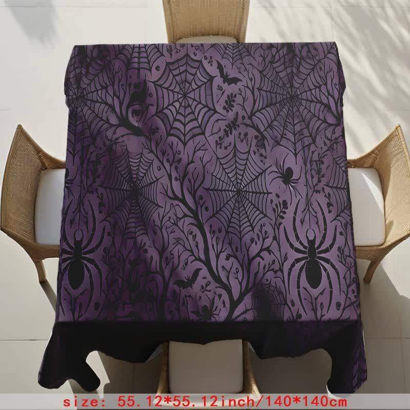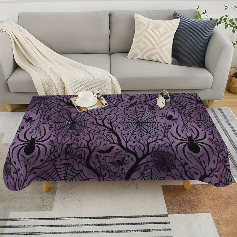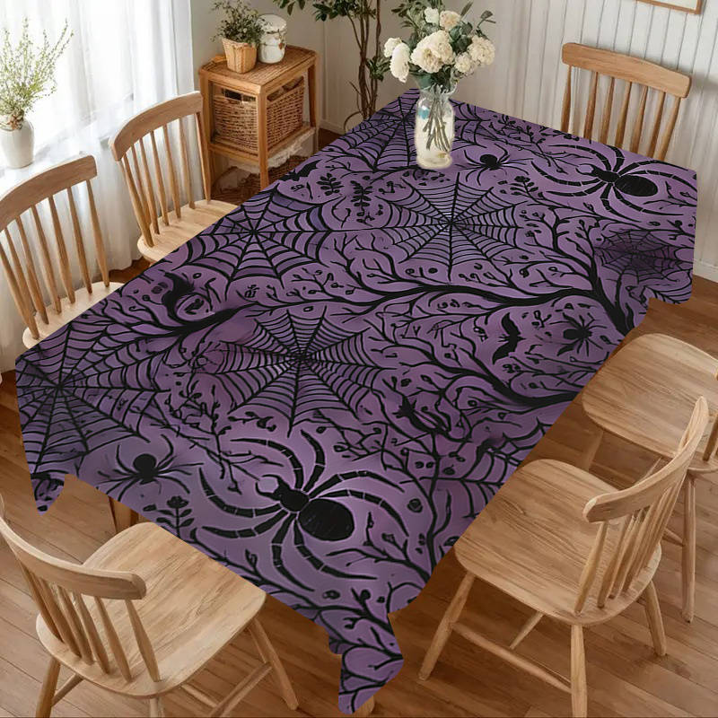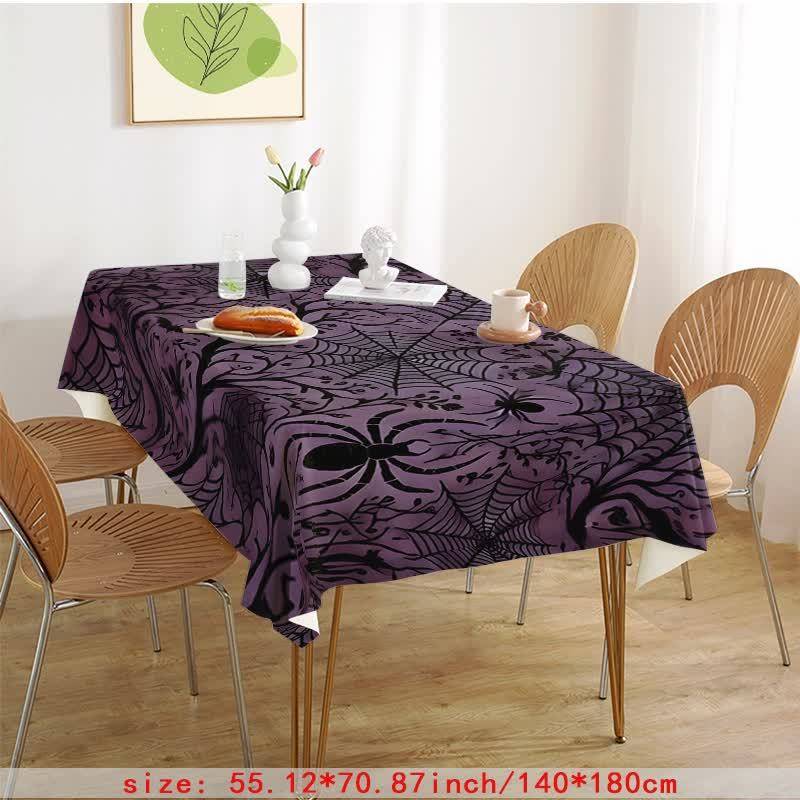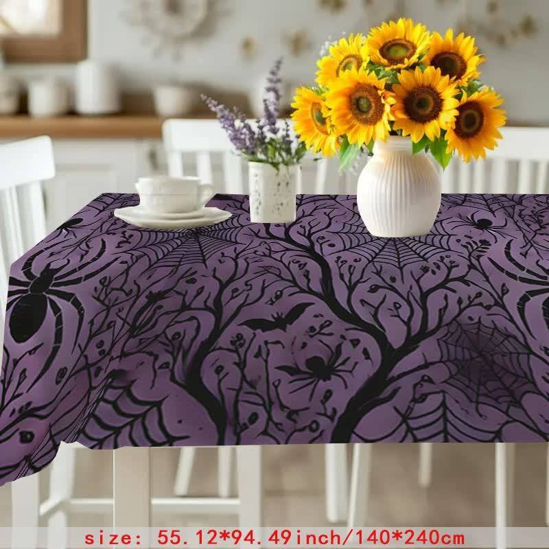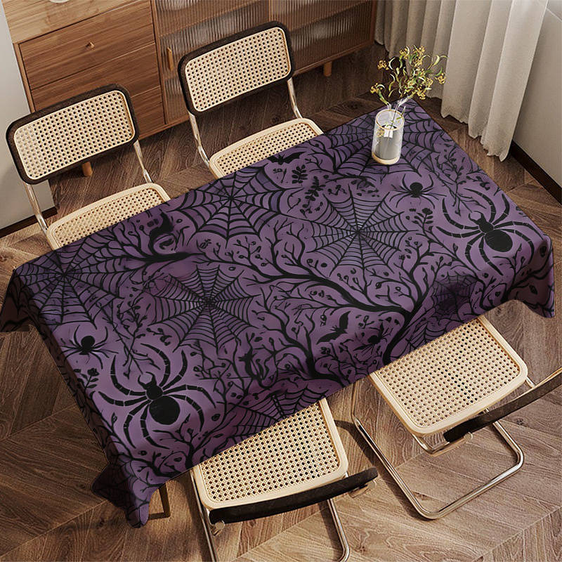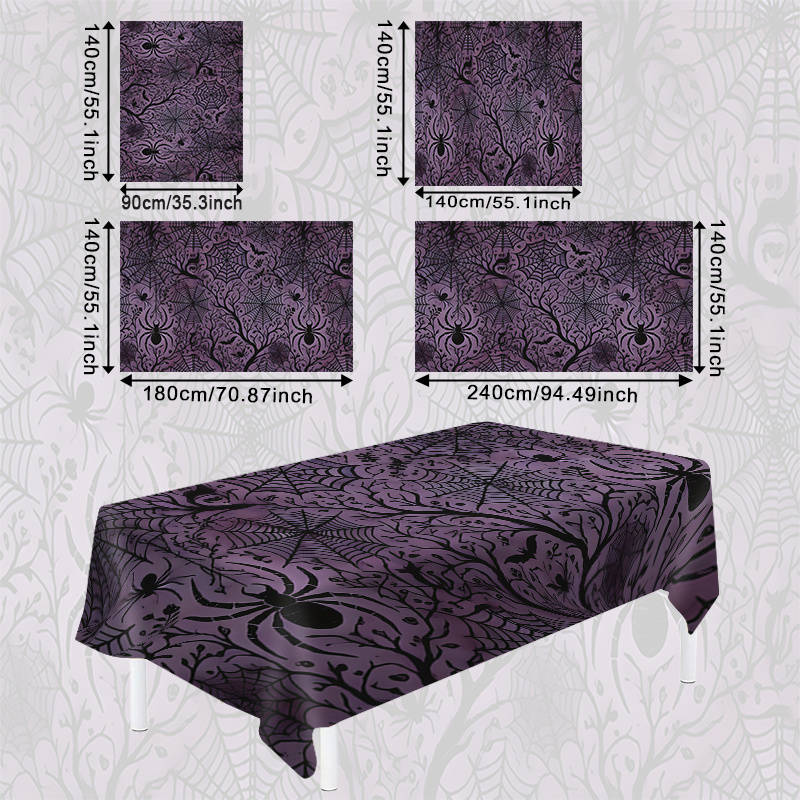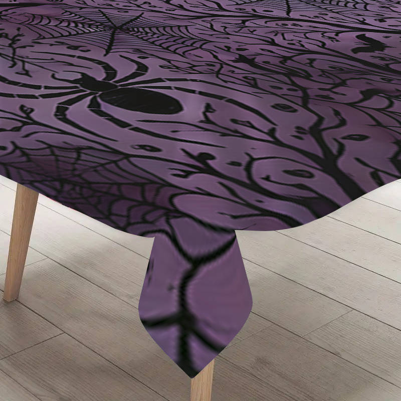 Spooky Halloween Tablecloth - Purple Web Pattern with Black Spider Silhouettes, Weave Type:Machine Made