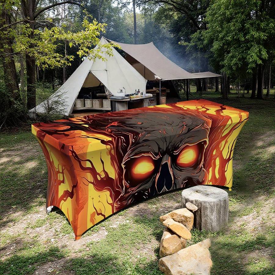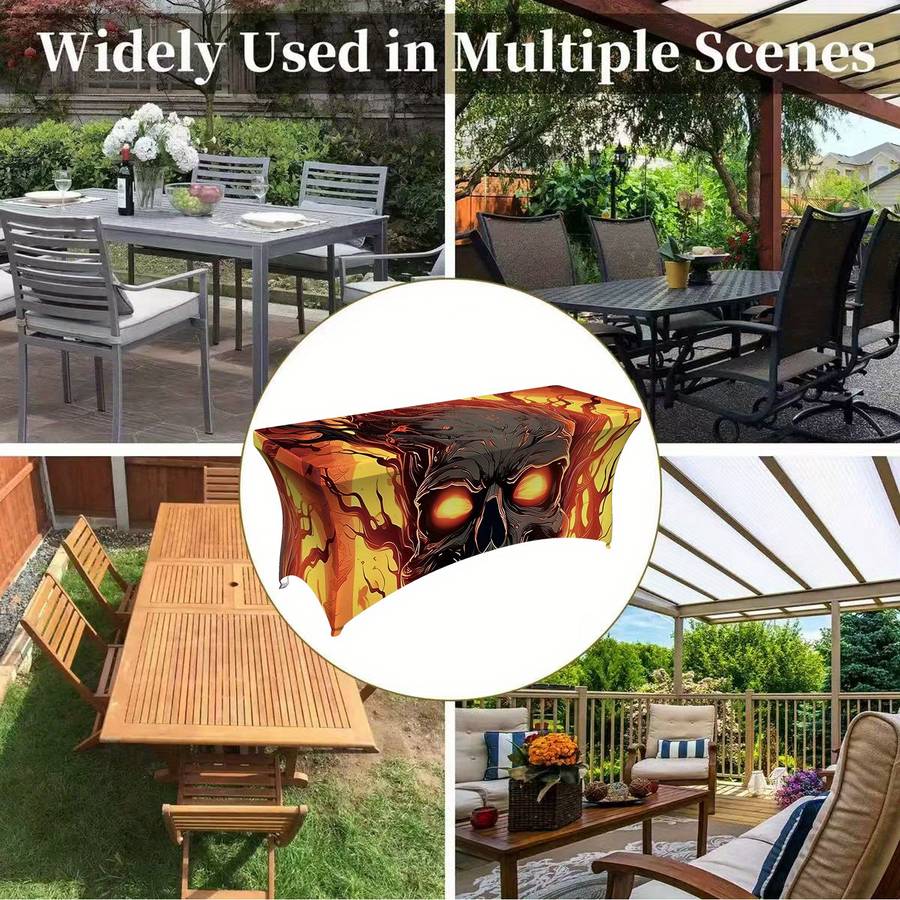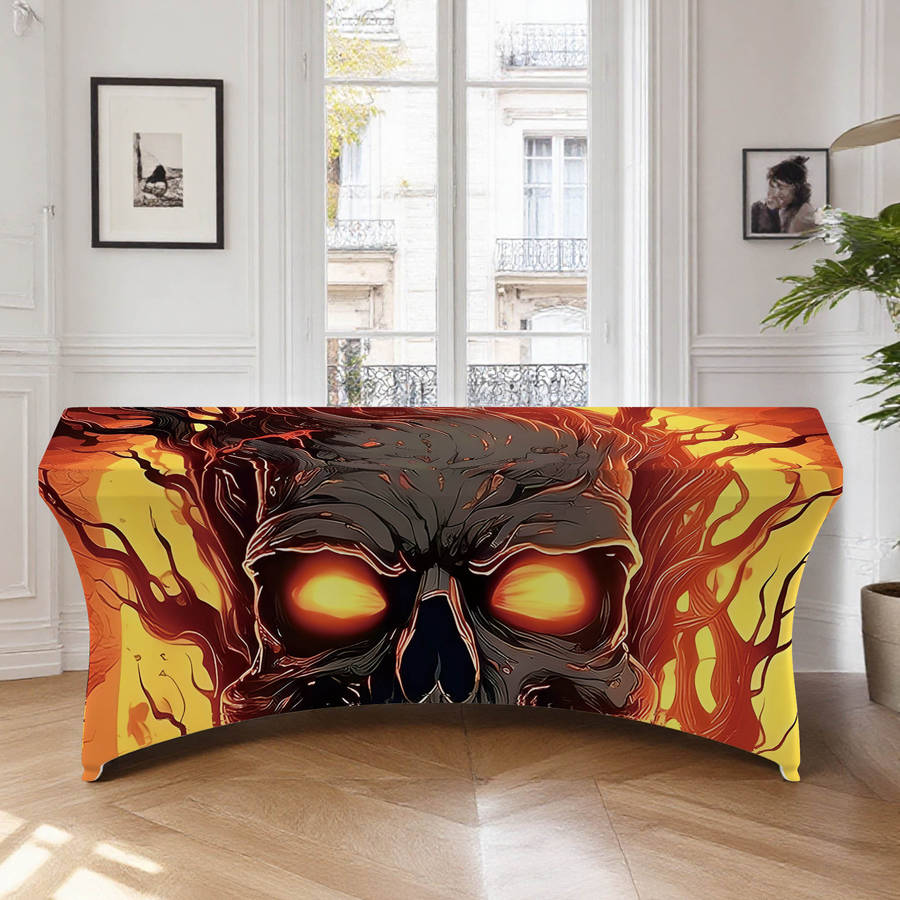 Open; 1pc Dark Fantasy Flame Skull Digital Print Full Coverage Stretch TableclotShape:Rectangle Weave Type:Machine Made Material:Polyester Cover Material:88% Polyester,12% Spandex Weaving Method:Woven