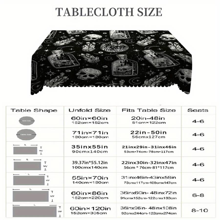 1pc Gothic Halloween Tablecloth - Black Background with Skulls, Bottles, Stars -Weave Type:Machine Made Material:Polyester Occasion:Generaling Fit Holidays:Universal Pattern:Other Patterns Theme:Other Topics