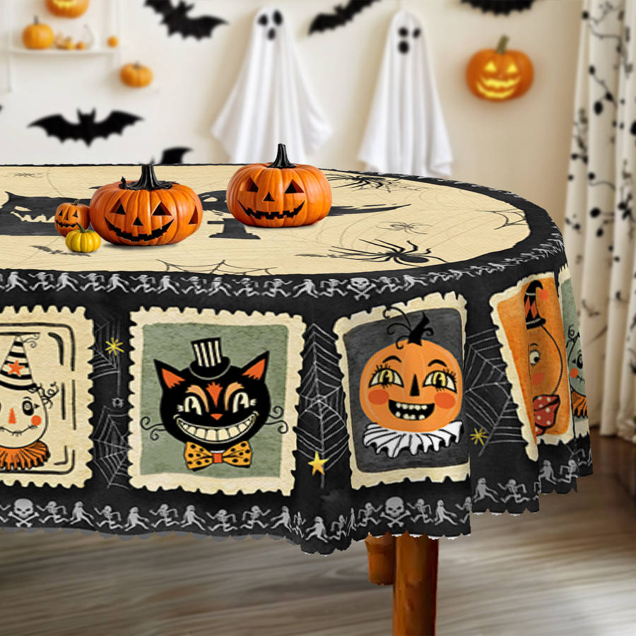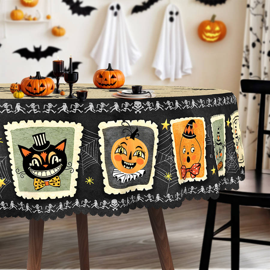 Halloween Tablecloth, Whimsical Cartoon Faces, Pumpkin and Black Cat Design, HalShape:Rectangle Weave Type:Machine Made Material:Polyester Cover Material:100% Polyester Weaving Method:Woven