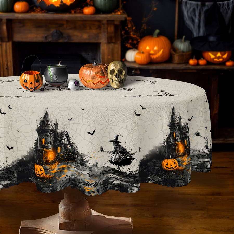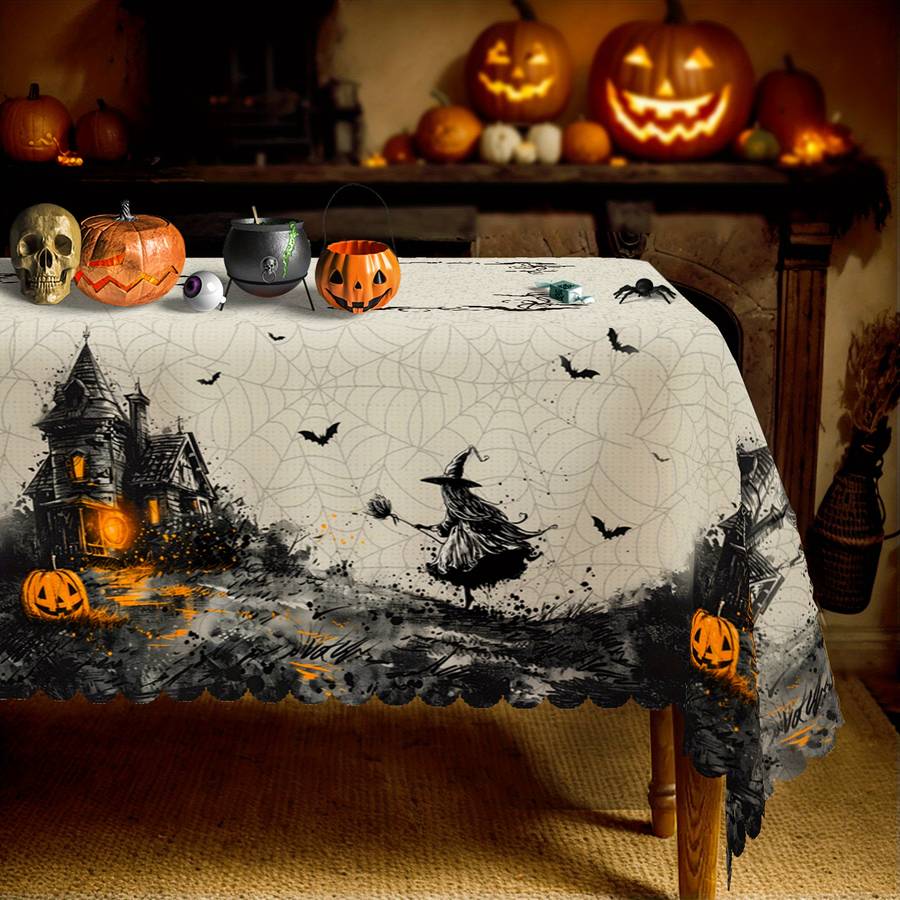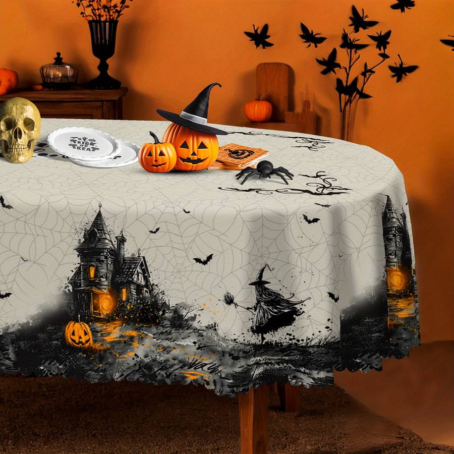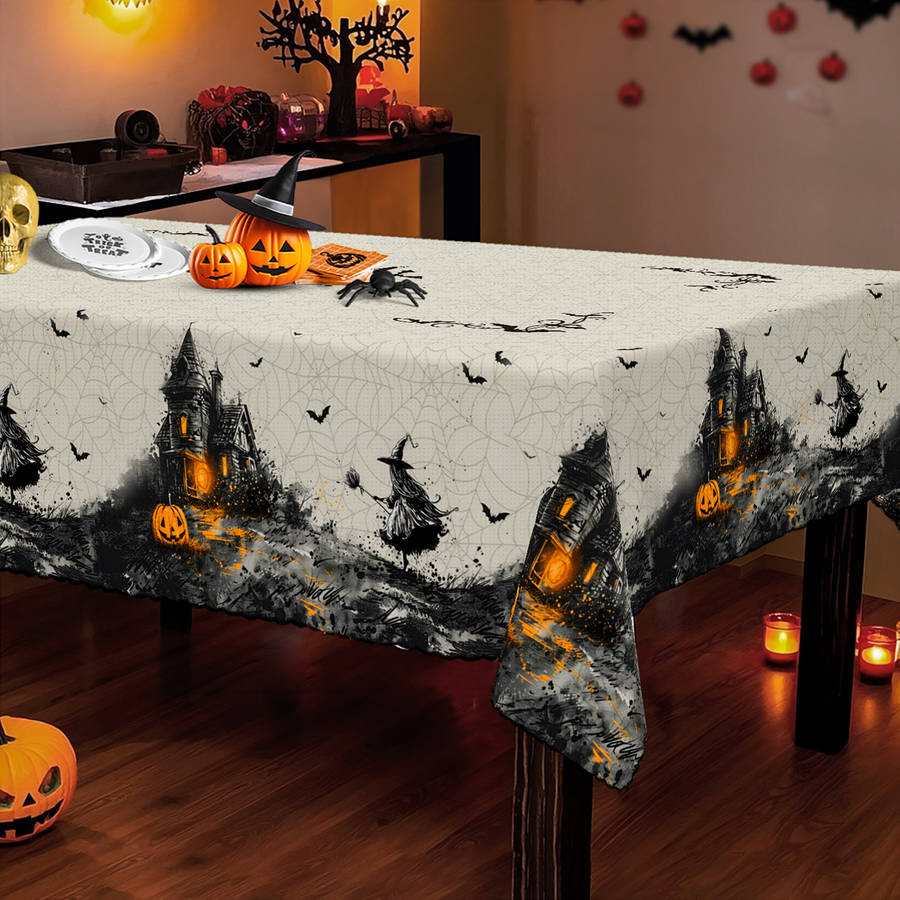 Vintage Halloween Tablecloth with Spooky Castle, Bat, Pumpkin, and Spider Web DeShape:Rectangle Weave Type:Machine Made Holidays:Halloween Material:Polyester Cover Material:100% Polyester Weaving Method:Woven
