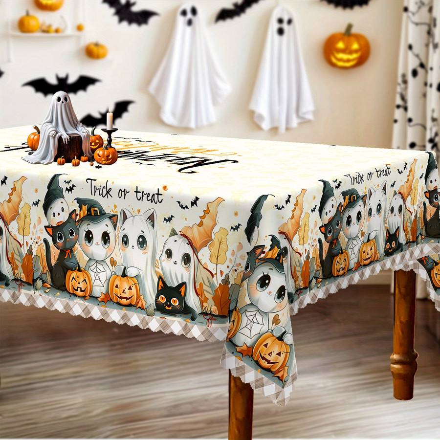 Halloween Tablecloth, Cute Kitten Pumpkin Bat Design, Perfect for Halloween and Shape:Rectangle Weave Type:Machine Made Holidays:Halloween Material:Polyester Cover Material:100% Polyester Weaving Method:Woven