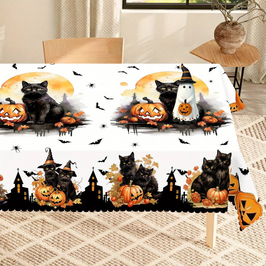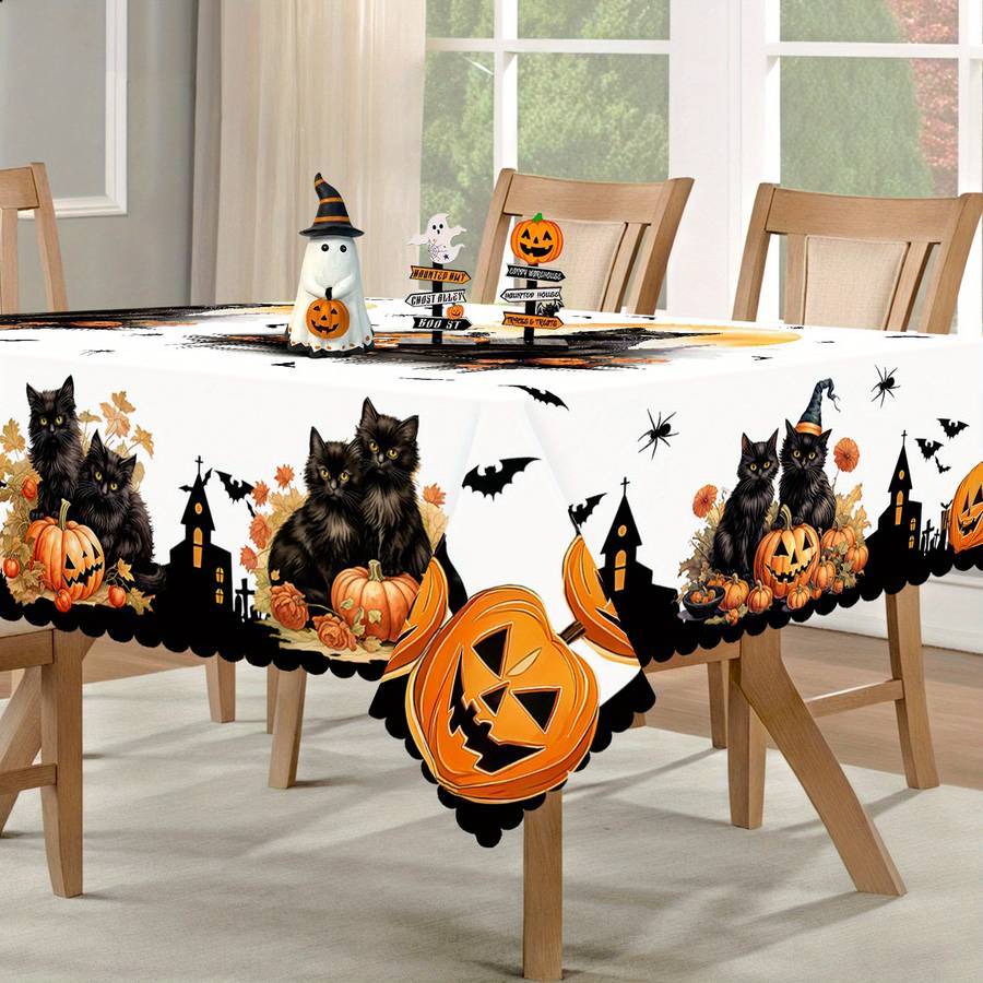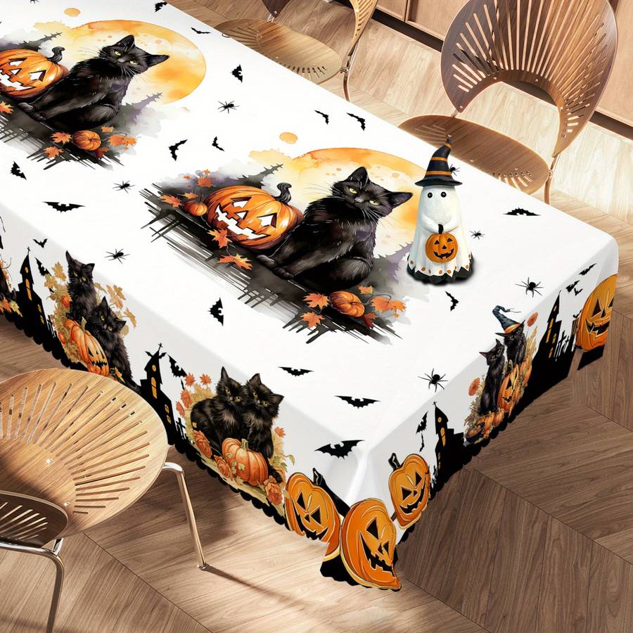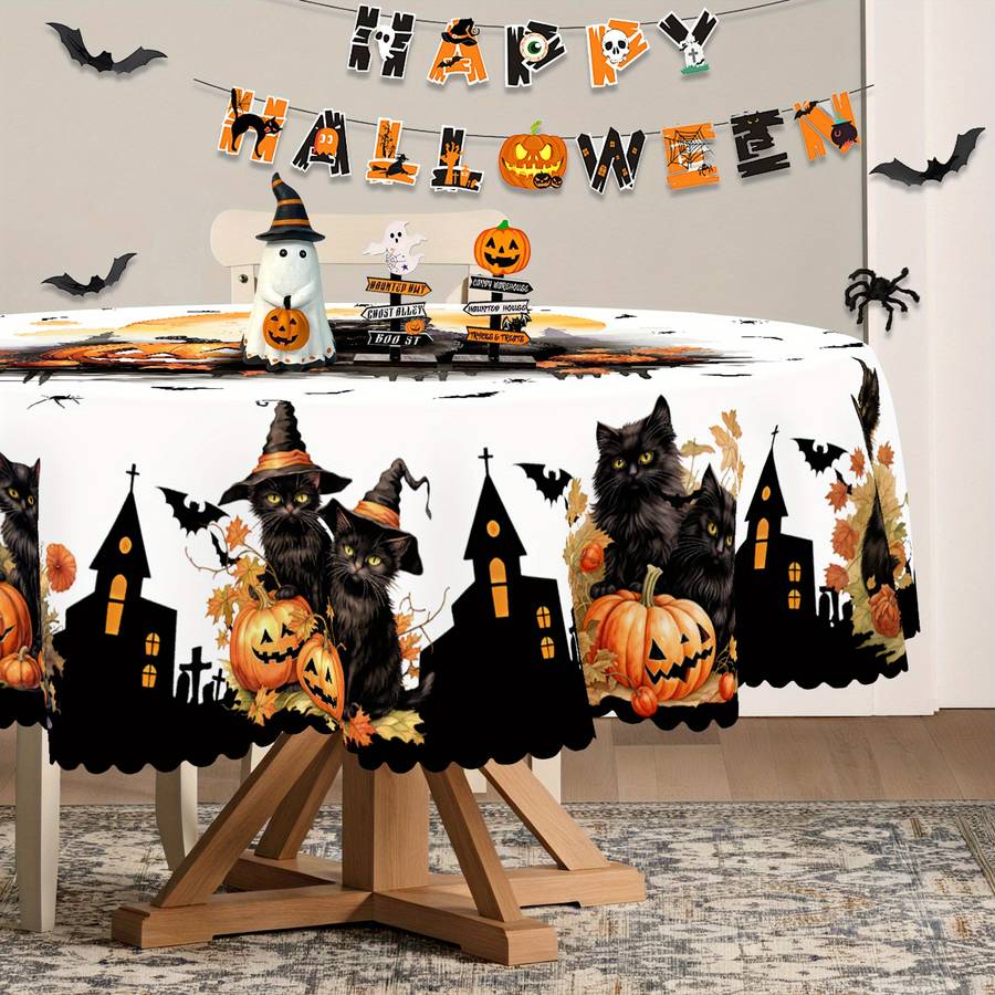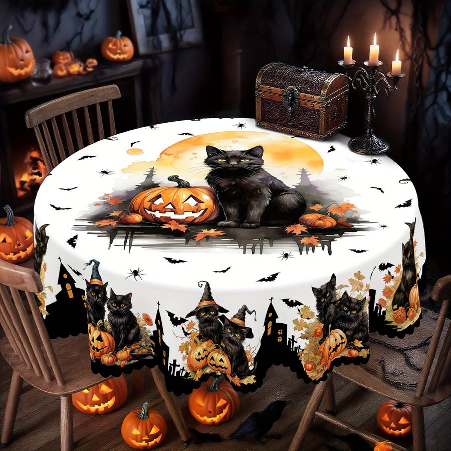 1pc Whimsical Halloween Tablecloth with Black Cats, Pumpkins & Bats Design - RouShape:Round Weave Type:Machine Made Material:Polyester Cover Material:100% Polyester Weaving Method:Woven Square Gram Weight (g/ᄅO):120-130g
