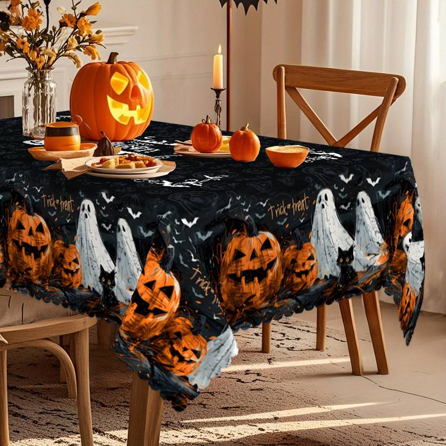 Vintage Halloween Tablecloth with Spooky Pumpkin, Black Cat, and Bat Design - PeShape:Rectangle Weave Type:Machine Made Holidays:Halloween Material:Polyester Cover Material:100% Polyester Weaving Method:Woven