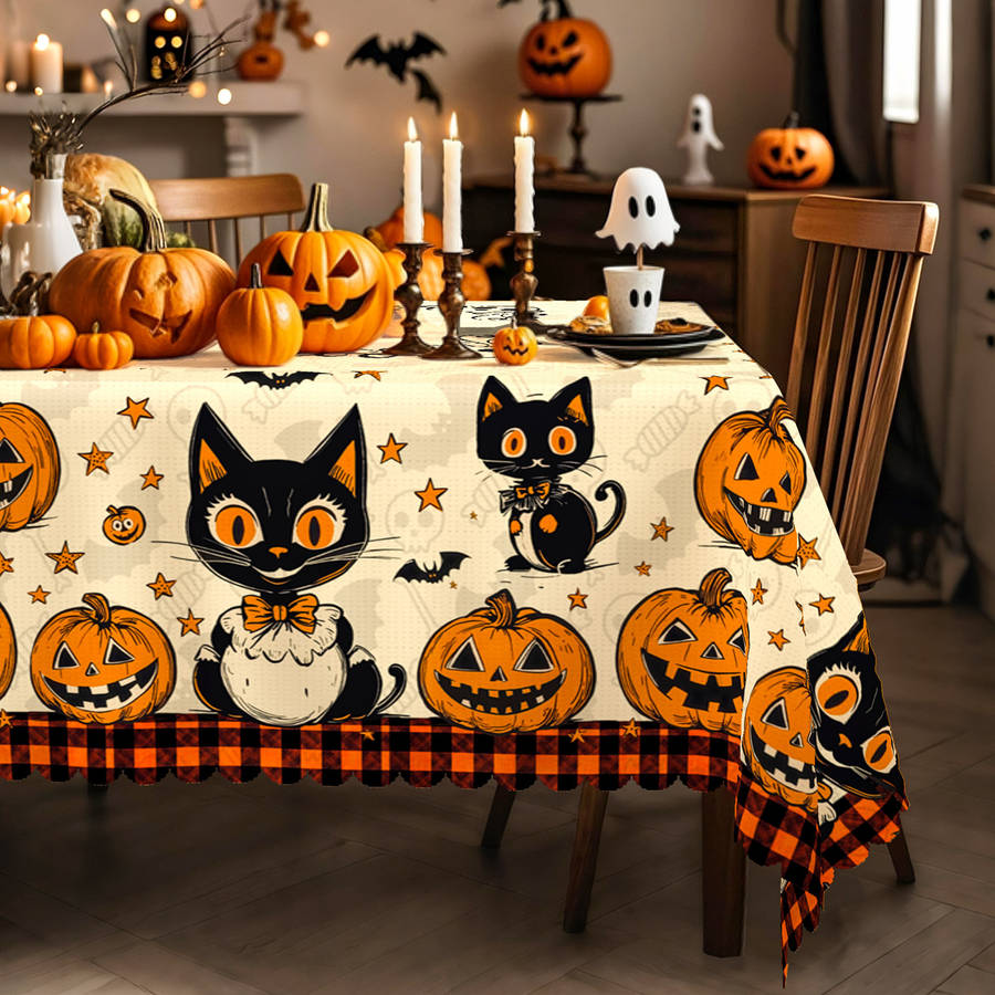 Halloween Cat Tablecloth - 1pc Red Decor, Black Cat Pumpkin Star Check Pattern, Shape:Rectangle Weave Type:Machine Made Material:Polyester Cover Material:100% Polyester Weaving Method:Woven